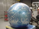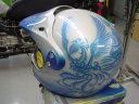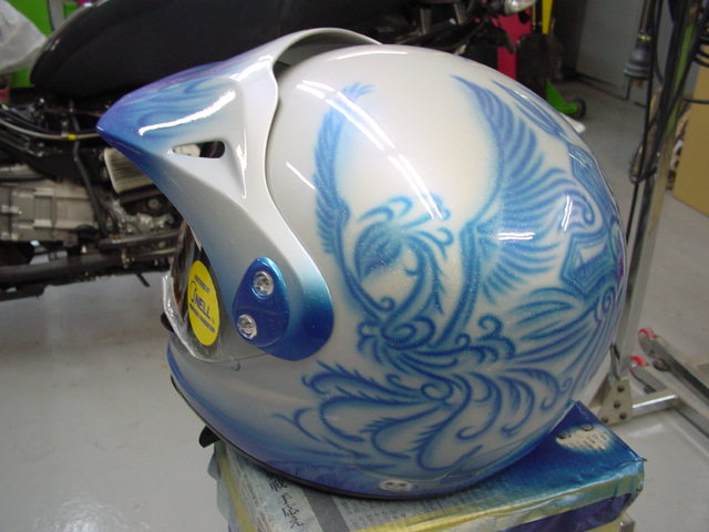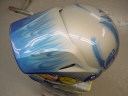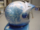 その後、ブルーのパールをかけて、レインボウフレークをのせて出来上がり。バイザーはフレイムスをブラシで・・