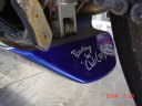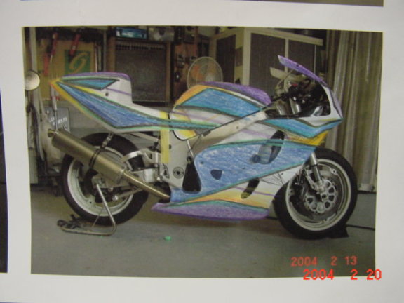 SBSホクブGSXR 走行会仕様のマシンをお任せで。オーナーのレーシングスーツに合わせたカラーリングです。 一番最初の画像がイメージスケッチ。ロゴが入るとかなり引き締まりますよ。 わかりにくいですがブルーの部分は微妙に色変化します。 私が考えた偏光ペイント”オジャマジョーラドレミちゃん”というテクを使っています。 ブルーの中はエアブラシで流星群を描いているんですが写ってないですね。しくしく。