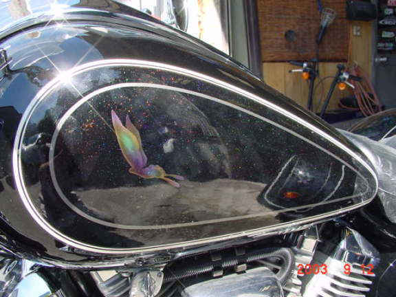 フロントフェンダー、タンクにはレインボウパールでエンブレムを作ってみました。